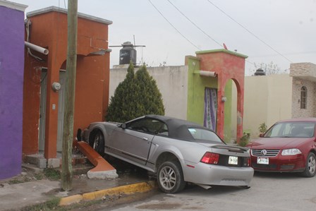 Fue cerca de las 17:10 horas de ayer en la calle Apóstol Pedro esquina con calle Santiago Mayor de la colonia el campanario donde un automóvil Mustang color gris con negro, el cual portaba placas de circulación FHM-7129 se proyectó contra la fachada del frente de una casa particular.