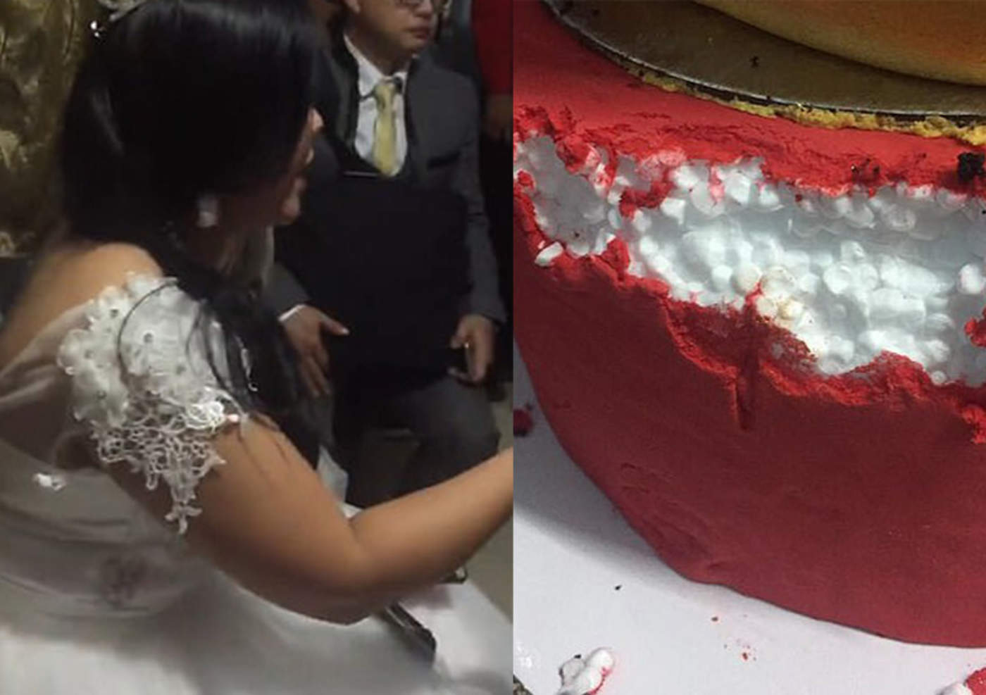Pero al regresar y partir el pastel, descubrieron que sólo estaba hecho de betún y unicel, por lo que la novia decepcionada rompió en llanto.
