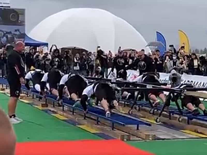 Un grupo de ocho hombres fuertes ucranianos tiraron el jueves del avión de carga más grande y pesado del mundo, el Antonov-225 "Mriya".